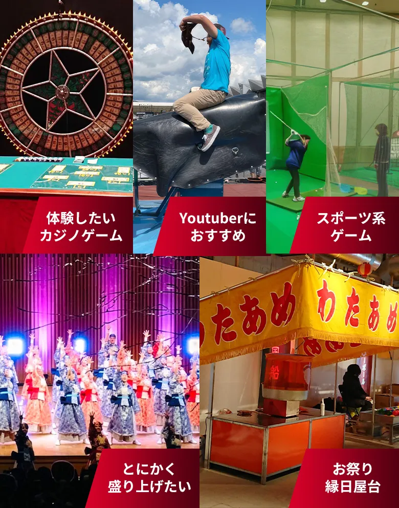 カジノ・カーニバルゲーム・ビンゴ・ゴルフゲーム・パーティーゲーム・抽選機・アナライザー・現金つかみ取り機・ スーパースピン・早押し機・キッズコーナー・縁日・ステージなど豊富に在庫。